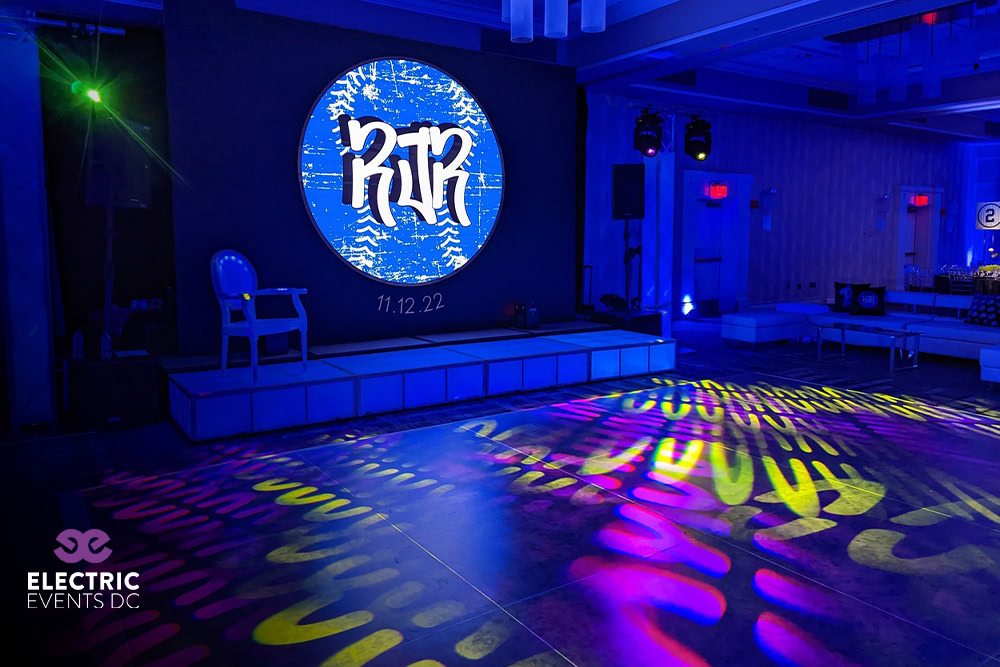 Gobo projections are done by placing names, logos, or patterns onto walls, floors, or ceilings. This works well for milestone birthdays, brand launches, and formal celebrations where you want a signature visual moment. A couple’s initials centered on the LED dance floor, or a company emblem behind a stage. We design the patterns that match your color palette, venue style, and overall theme. The goal is subtle impact, not distraction, so guests notice the detail without feeling overwhelmed. These lighting effects turn blank surfaces into meaningful visuals that people remember long after the event ends.