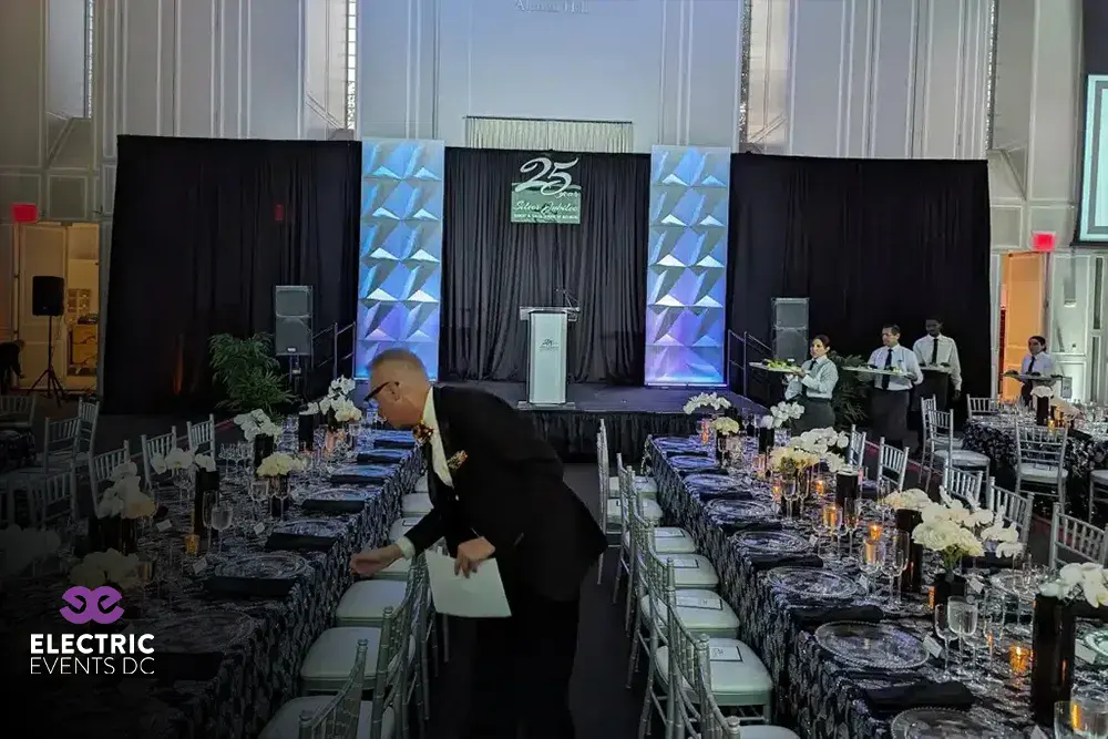 At Electric Events DC, we specialize in Maryland Corporate Event Production, offering an extensive range of professional event services designed to bring your corporate occasions to life. We take pride in our successful execution of the 25-Year Silver Jubilee for the Robert H. Smith School of Business at the University of Maryland, where our expert team delivered an array of bespoke event elements from sophisticated lounge furniture rentals to a grand stage setup. Our commitment to excellence is evident through our carefully crafted centerpieces, meticulously programmed lighting, and state-of-the-art AV production, ensuring each event we handle resonates with sophistication and flair. Check out this blog post to learn more about our successful event at the University of Maryland.